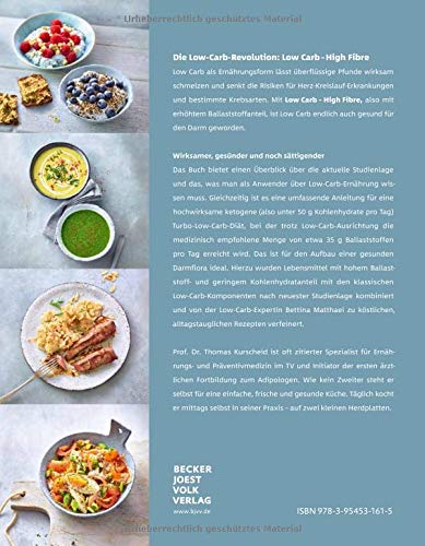 Low Carb ist seit vielen Jahren buchstäblich in aller Munde. Seither hat die Ausrichtung eine durchaus bedeutende Änderung erfahren. Während anfänglich noch Low Carb – Low Fat gepredigt wurde, sahen die Ernährungsexperten weltweit bald Low Carb – High Fat als bedeutend gesünder an. Es ist an der Zeit, hier wieder eine neue solide, aktuelle wissenschaftliche Basis zu schaffen, auf dem neuesten Stand der Wissenschaft. Mit Low Carb – High Fibre, also mit erhöhtem Ballaststoffanteil, ist die Low-Carb-Ernährung noch einmal gesünder und sättigender geworden. Wer schneller abnehmen möchte, nutzt zusätzlich den Keto-Booster. Professor Dr. Thomas Kurscheid ist einer der bekanntesten deutschen Ernährungsmediziner. Er ist nicht nur Initiator der ersten Adipositas-Weiterbildung für Ärzte (und andere Gesundheitsberufe), sondern in den Medien oft zitierter Spezialist für Ernährungs- und Präventivmedizin. Für die praktische Umsetzung bietet dieses Buch einen konkreten Fahrplan für 28 Tage, inklusive wirklich alltagstauglicher Rezepte, welche die Pfunde schnell, aber gesund purzeln lassen. Wie kein Zweiter steht Professor Kurscheid selbst für eine einfache, frische Küche. Täglich kocht er selbst mittags in seiner Praxis – einfach auf zwei Herdplatten. Die Rezepte entstanden in der Küche von Low-Carb- und Keto-Expertin und Buchautorin Bettina Matthaei.