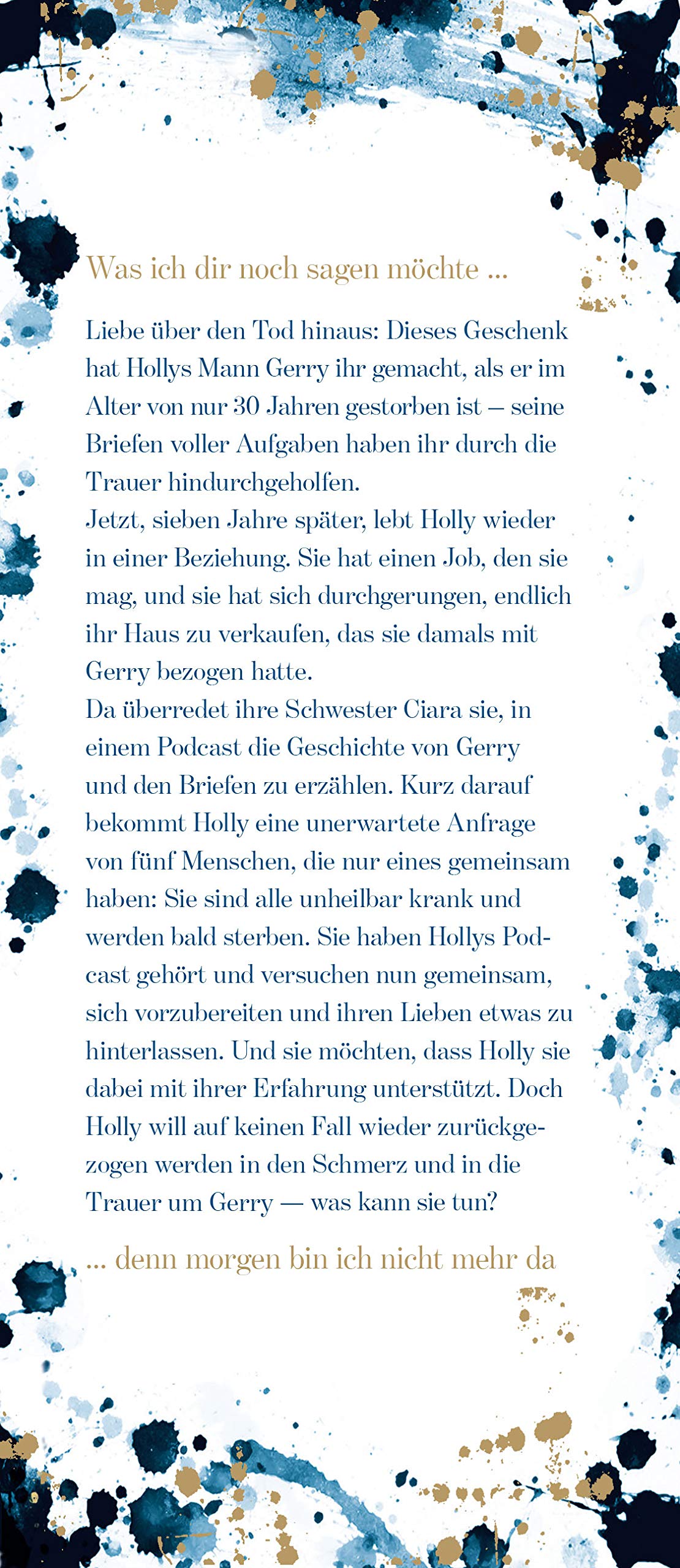 Vor sieben Jahren ist Holly Kennedys geliebter Mann Gerry viel zu jung an Krebs gestorben. Er hat ihr ein wunderbares Geschenk hinterlassen: eine Reihe von Briefen, die sie durch die Trauer begleitet haben. Holly ist stolz darauf, dass sie sich inzwischen ein neues Leben aufgebaut hat. Da wird sie von einer kleinen Gruppe von Menschen angesprochen, die alle unheilbar krank sind. Inspiriert von Gerrys Geschichte, möchten sie ihren Lieben ebenfalls Botschaften hinterlassen.